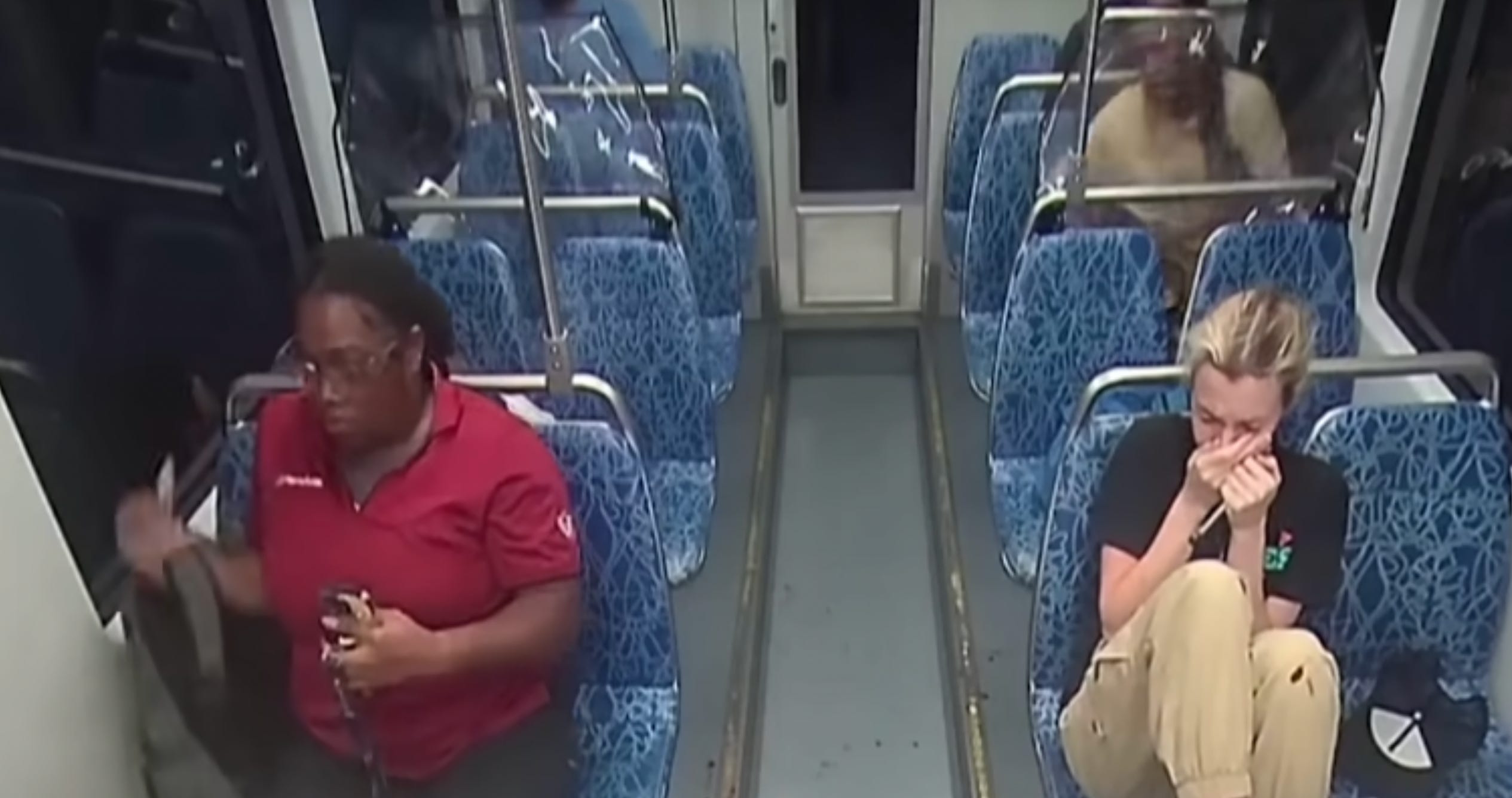 If you study the two actors in the Charlotte train before the fake stabbing, they look twitchy, as if they are preparing to get into their roles. And how is Iryna suddenly able to read her mobile phone without glasses? She had them on in the early stages of the journey but took them off for some reason and continued to read. Maybe because she knew they might get in the way.