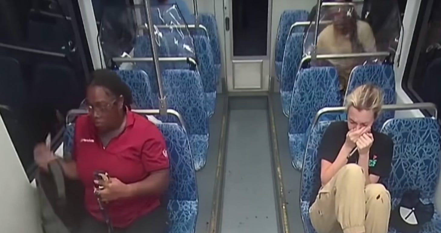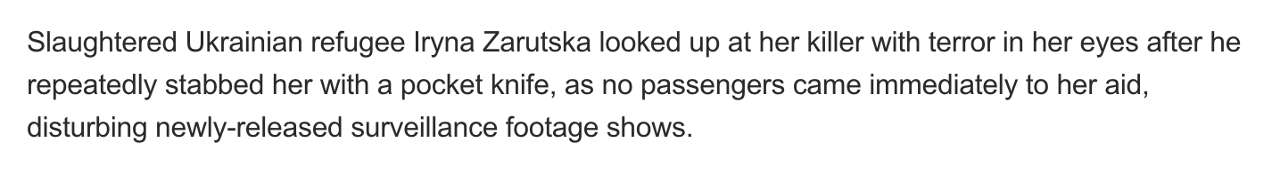 More quirks in the storyline. The fake news are reporting Iryna was stabbed multiple times but the video shows only once. And the reason the other crisis actors in the carriage don’t react is in order to create an ‘outrage’ narrative in the plot which a lot of white boys are running with to fuel the fear and division: ‘nobody came to her assistance’ Aaggh. We’re all gonna die. Better not use public transport again. Better stay home.
