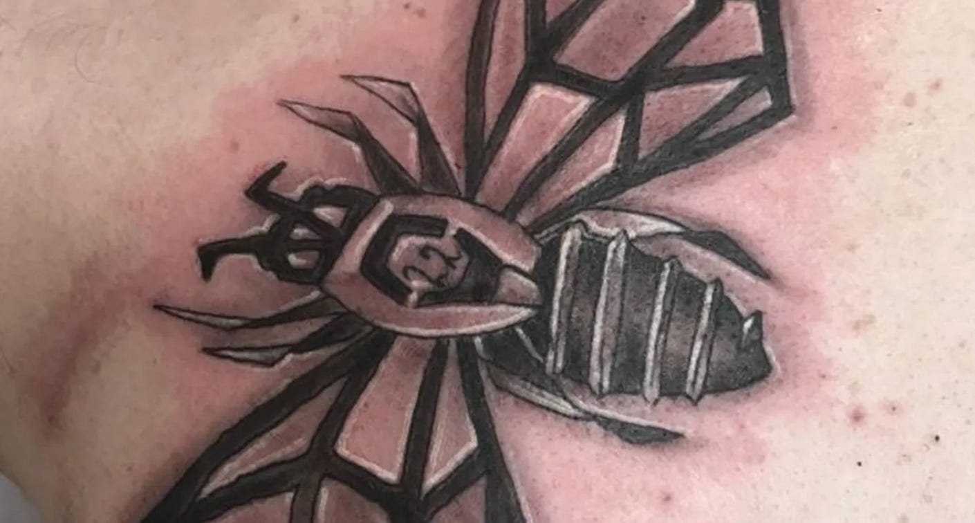 And look at the tattoo on Brown’s neck. It looks like a bee - the freemasonic symbol of the tireless worker in the hive who has already sold their soul and is keen to climb up the ranks. Remember they tattoed a bee onto Martin ‘Hibbert The Fibbert’ of Manchester Arena Hoax infamy while he was in hospital. As you do…