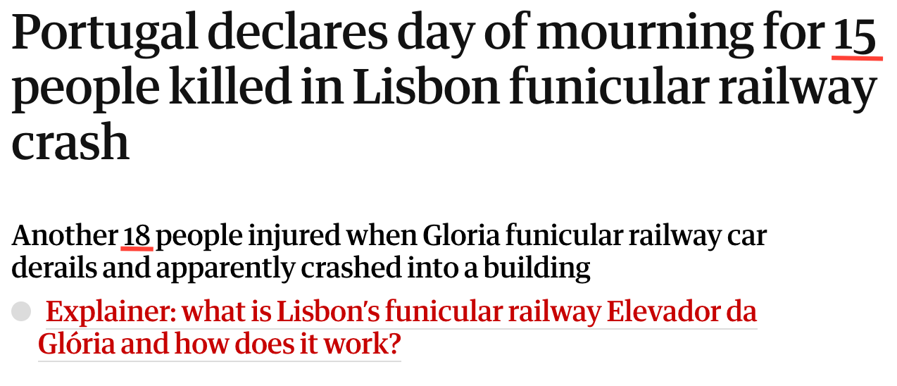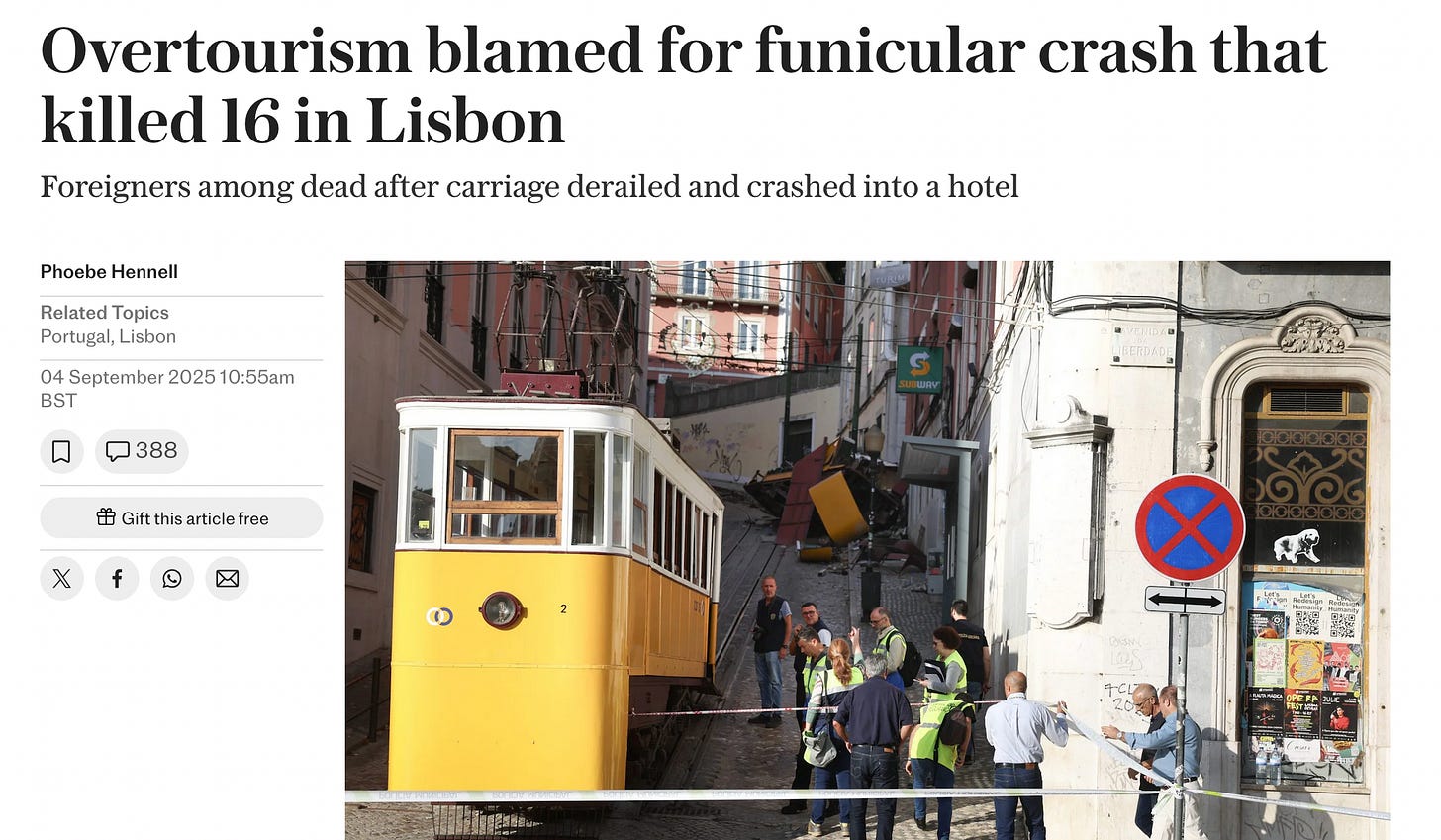 Did you know that 33 million tourists are predicted to travel to Portugal in 2025? I kid you not. And here’s another quirky story for you: Portugal recently warned 33 million Brits to be careful when using their dashcams on holiday there. What are the chances of that magic number being plucked from the air by the media on two separate occasions in recent months? About the same as the steel cable on the 140-year-old funicular in Lisbon snapping in two. Of course both 33 stories were inane media fabrications (when they use their hoax code 33, they’re signalling to each other that it’s fake) and it seems last week’s tram ‘crash’ doesn’t stand up to scrutiny either.